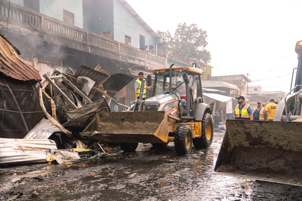 Los equipos de la Municipalidad de San Pedro Sula, que lidera el alcalde Roberto Contreras, continúan ejecutando labores de limpieza en el Mercado Medina, en el área donde la noche del lunes se registró un incendio que provocó pérdidas millonarias, afectando a más de 100 locatarios.