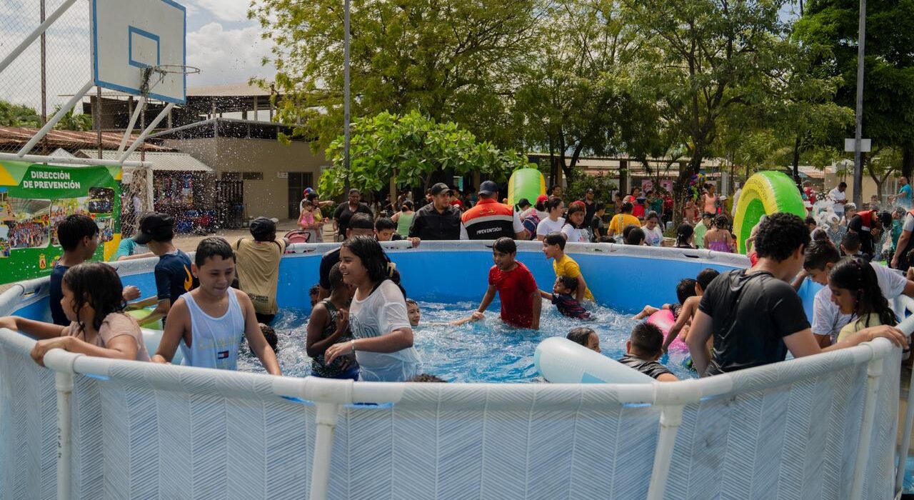 Los equipos de la Dirección de Prevención instalaron piscinas y el tobogán acuático en el parque de la Rivera Hernández, donde los pequeños bañaron y disfrutaron en un ambiente lleno de alegría y diversión.