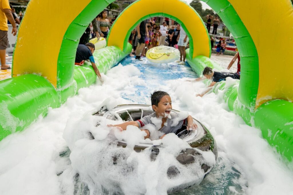 Durante la actividad, más de 300 pequeños viveron una tarde inolvidable que incluyó acceso a piscinas, emocionantes toboganes con espuma, saltarines y juegos de trampolín.