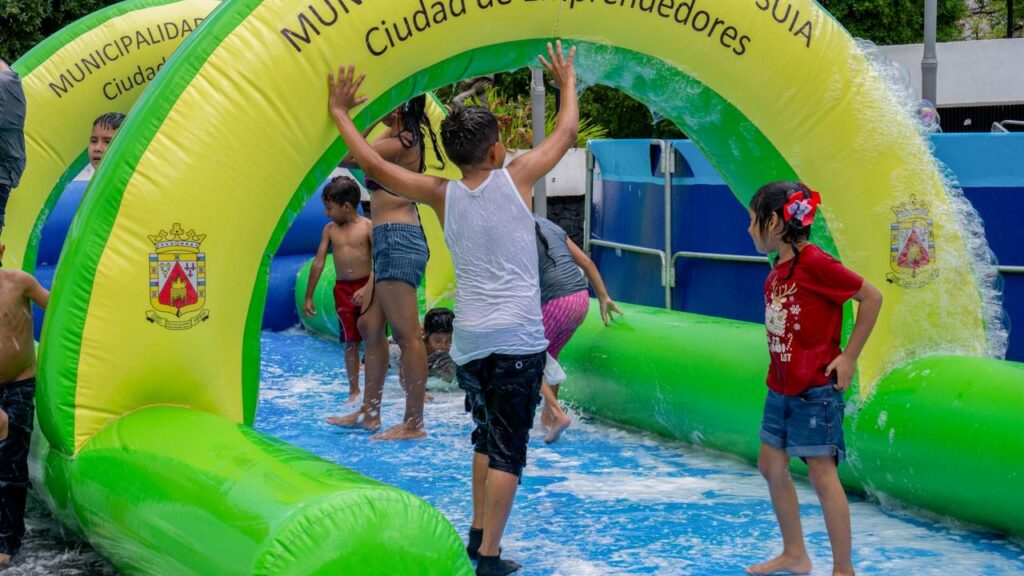 Los equipos municipales instalaron piscinas y el tobogán acuático en el Parque Central, donde los pequeños se refrescaron bañando y disfrutaron en un ambiente lleno de alegría, sano y seguro.