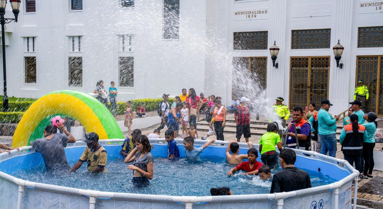 Los equipos municipales instalaron piscinas y el tobogán acuático en el Parque Central, donde los pequeños se refrescaron bañando y disfrutaron en un ambiente lleno de alegría, sano y seguro.